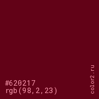 Цвет #620217 в цветовой модели RGB обозначается тремя октетами (98, 2, 23) в десятичном формате и #620217 в шестнадцатиричном (hex) формате, которые являются интенсивностью красного 98 (hex 62), интенсивность зелёного 2 (hex 02) и интенсивность синего 23 (hex 17).