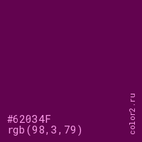 Цвет #62034F в цветовой модели RGB обозначается тремя октетами (98, 3, 79) в десятичном формате и #62034F в шестнадцатиричном (hex) формате, которые являются интенсивностью красного 98 (hex 62), интенсивность зелёного 3 (hex 03) и интенсивность синего 79 (hex 4F).