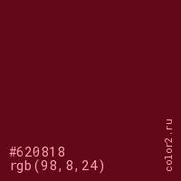 Цвет #620818 в цветовой модели RGB обозначается тремя октетами (98, 8, 24) в десятичном формате и #620818 в шестнадцатиричном (hex) формате, которые являются интенсивностью красного 98 (hex 62), интенсивность зелёного 8 (hex 08) и интенсивность синего 24 (hex 18).