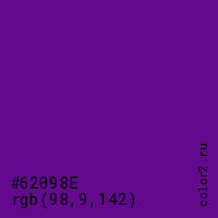 Цвет #62098E в цветовой модели RGB обозначается тремя октетами (98, 9, 142) в десятичном формате и #62098E в шестнадцатиричном (hex) формате, которые являются интенсивностью красного 98 (hex 62), интенсивность зелёного 9 (hex 09) и интенсивность синего 142 (hex 8E).