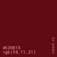 Цвет #620B15 в цветовой модели RGB обозначается тремя октетами (98, 11, 21) в десятичном формате и #620B15 в шестнадцатиричном (hex) формате, которые являются интенсивностью красного 98 (hex 62), интенсивность зелёного 11 (hex 0B) и интенсивность синего 21 (hex 15).