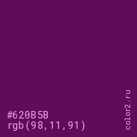 Цвет #620B5B в цветовой модели RGB обозначается тремя октетами (98, 11, 91) в десятичном формате и #620B5B в шестнадцатиричном (hex) формате, которые являются интенсивностью красного 98 (hex 62), интенсивность зелёного 11 (hex 0B) и интенсивность синего 91 (hex 5B).