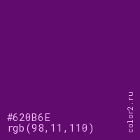 Цвет #620B6E в цветовой модели RGB обозначается тремя октетами (98, 11, 110) в десятичном формате и #620B6E в шестнадцатиричном (hex) формате, которые являются интенсивностью красного 98 (hex 62), интенсивность зелёного 11 (hex 0B) и интенсивность синего 110 (hex 6E).