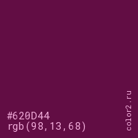 Цвет #620D44 в цветовой модели RGB обозначается тремя октетами (98, 13, 68) в десятичном формате и #620D44 в шестнадцатиричном (hex) формате, которые являются интенсивностью красного 98 (hex 62), интенсивность зелёного 13 (hex 0D) и интенсивность синего 68 (hex 44).