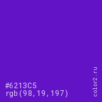 Цвет #6213C5 в цветовой модели RGB обозначается тремя октетами (98, 19, 197) в десятичном формате и #6213C5 в шестнадцатиричном (hex) формате, которые являются интенсивностью красного 98 (hex 62), интенсивность зелёного 19 (hex 13) и интенсивность синего 197 (hex C5).