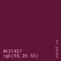Цвет #621437 в цветовой модели RGB обозначается тремя октетами (98, 20, 55) в десятичном формате и #621437 в шестнадцатиричном (hex) формате, которые являются интенсивностью красного 98 (hex 62), интенсивность зелёного 20 (hex 14) и интенсивность синего 55 (hex 37).
