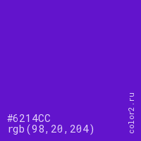 Цвет #6214CC в цветовой модели RGB обозначается тремя октетами (98, 20, 204) в десятичном формате и #6214CC в шестнадцатиричном (hex) формате, которые являются интенсивностью красного 98 (hex 62), интенсивность зелёного 20 (hex 14) и интенсивность синего 204 (hex CC).