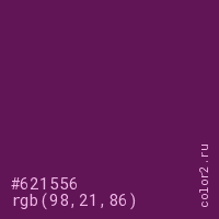Цвет #621556 в цветовой модели RGB обозначается тремя октетами (98, 21, 86) в десятичном формате и #621556 в шестнадцатиричном (hex) формате, которые являются интенсивностью красного 98 (hex 62), интенсивность зелёного 21 (hex 15) и интенсивность синего 86 (hex 56).