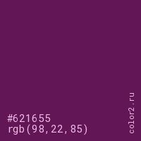 Цвет #621655 в цветовой модели RGB обозначается тремя октетами (98, 22, 85) в десятичном формате и #621655 в шестнадцатиричном (hex) формате, которые являются интенсивностью красного 98 (hex 62), интенсивность зелёного 22 (hex 16) и интенсивность синего 85 (hex 55).