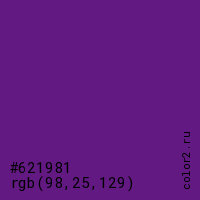 Цвет #621981 в цветовой модели RGB обозначается тремя октетами (98, 25, 129) в десятичном формате и #621981 в шестнадцатиричном (hex) формате, которые являются интенсивностью красного 98 (hex 62), интенсивность зелёного 25 (hex 19) и интенсивность синего 129 (hex 81).