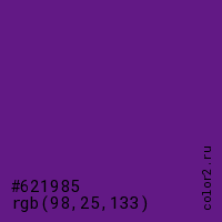 Цвет #621985 в цветовой модели RGB обозначается тремя октетами (98, 25, 133) в десятичном формате и #621985 в шестнадцатиричном (hex) формате, которые являются интенсивностью красного 98 (hex 62), интенсивность зелёного 25 (hex 19) и интенсивность синего 133 (hex 85).