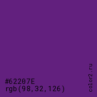 Цвет #62207E в цветовой модели RGB обозначается тремя октетами (98, 32, 126) в десятичном формате и #62207E в шестнадцатиричном (hex) формате, которые являются интенсивностью красного 98 (hex 62), интенсивность зелёного 32 (hex 20) и интенсивность синего 126 (hex 7E).