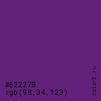 Цвет #62227B в цветовой модели RGB обозначается тремя октетами (98, 34, 123) в десятичном формате и #62227B в шестнадцатиричном (hex) формате, которые являются интенсивностью красного 98 (hex 62), интенсивность зелёного 34 (hex 22) и интенсивность синего 123 (hex 7B).