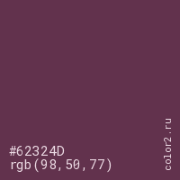 Цвет #62324D в цветовой модели RGB обозначается тремя октетами (98, 50, 77) в десятичном формате и #62324D в шестнадцатиричном (hex) формате, которые являются интенсивностью красного 98 (hex 62), интенсивность зелёного 50 (hex 32) и интенсивность синего 77 (hex 4D).