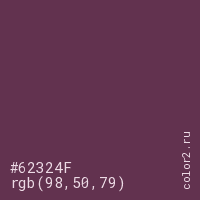 Цвет #62324F в цветовой модели RGB обозначается тремя октетами (98, 50, 79) в десятичном формате и #62324F в шестнадцатиричном (hex) формате, которые являются интенсивностью красного 98 (hex 62), интенсивность зелёного 50 (hex 32) и интенсивность синего 79 (hex 4F).