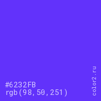 Цвет #6232FB в цветовой модели RGB обозначается тремя октетами (98, 50, 251) в десятичном формате и #6232FB в шестнадцатиричном (hex) формате, которые являются интенсивностью красного 98 (hex 62), интенсивность зелёного 50 (hex 32) и интенсивность синего 251 (hex FB).