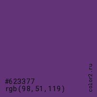 Цвет #623377 в цветовой модели RGB обозначается тремя октетами (98, 51, 119) в десятичном формате и #623377 в шестнадцатиричном (hex) формате, которые являются интенсивностью красного 98 (hex 62), интенсивность зелёного 51 (hex 33) и интенсивность синего 119 (hex 77).