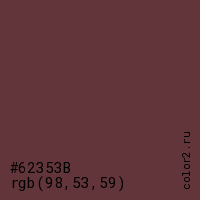 Цвет #62353B в цветовой модели RGB обозначается тремя октетами (98, 53, 59) в десятичном формате и #62353B в шестнадцатиричном (hex) формате, которые являются интенсивностью красного 98 (hex 62), интенсивность зелёного 53 (hex 35) и интенсивность синего 59 (hex 3B).
