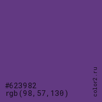 Цвет #623982 в цветовой модели RGB обозначается тремя октетами (98, 57, 130) в десятичном формате и #623982 в шестнадцатиричном (hex) формате, которые являются интенсивностью красного 98 (hex 62), интенсивность зелёного 57 (hex 39) и интенсивность синего 130 (hex 82).