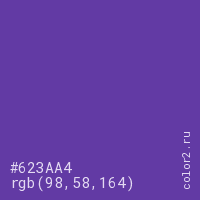 Цвет #623AA4 в цветовой модели RGB обозначается тремя октетами (98, 58, 164) в десятичном формате и #623AA4 в шестнадцатиричном (hex) формате, которые являются интенсивностью красного 98 (hex 62), интенсивность зелёного 58 (hex 3A) и интенсивность синего 164 (hex A4).
