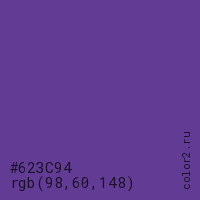 Цвет #623C94 в цветовой модели RGB обозначается тремя октетами (98, 60, 148) в десятичном формате и #623C94 в шестнадцатиричном (hex) формате, которые являются интенсивностью красного 98 (hex 62), интенсивность зелёного 60 (hex 3C) и интенсивность синего 148 (hex 94).