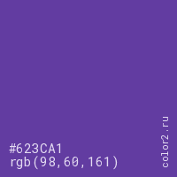 Цвет #623CA1 в цветовой модели RGB обозначается тремя октетами (98, 60, 161) в десятичном формате и #623CA1 в шестнадцатиричном (hex) формате, которые являются интенсивностью красного 98 (hex 62), интенсивность зелёного 60 (hex 3C) и интенсивность синего 161 (hex A1).