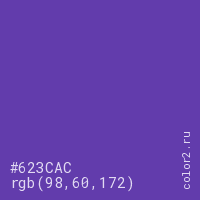 Цвет #623CAC в цветовой модели RGB обозначается тремя октетами (98, 60, 172) в десятичном формате и #623CAC в шестнадцатиричном (hex) формате, которые являются интенсивностью красного 98 (hex 62), интенсивность зелёного 60 (hex 3C) и интенсивность синего 172 (hex AC).