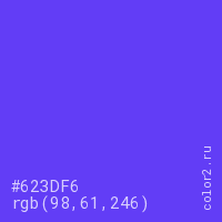 Цвет #623DF6 в цветовой модели RGB обозначается тремя октетами (98, 61, 246) в десятичном формате и #623DF6 в шестнадцатиричном (hex) формате, которые являются интенсивностью красного 98 (hex 62), интенсивность зелёного 61 (hex 3D) и интенсивность синего 246 (hex F6).