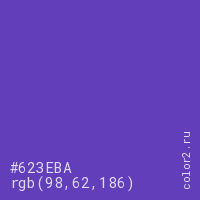 Цвет #623EBA в цветовой модели RGB обозначается тремя октетами (98, 62, 186) в десятичном формате и #623EBA в шестнадцатиричном (hex) формате, которые являются интенсивностью красного 98 (hex 62), интенсивность зелёного 62 (hex 3E) и интенсивность синего 186 (hex BA).