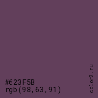 Цвет #623F5B в цветовой модели RGB обозначается тремя октетами (98, 63, 91) в десятичном формате и #623F5B в шестнадцатиричном (hex) формате, которые являются интенсивностью красного 98 (hex 62), интенсивность зелёного 63 (hex 3F) и интенсивность синего 91 (hex 5B).
