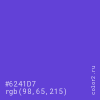 Цвет #6241D7 в цветовой модели RGB обозначается тремя октетами (98, 65, 215) в десятичном формате и #6241D7 в шестнадцатиричном (hex) формате, которые являются интенсивностью красного 98 (hex 62), интенсивность зелёного 65 (hex 41) и интенсивность синего 215 (hex D7).