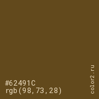 Цвет #62491C в цветовой модели RGB обозначается тремя октетами (98, 73, 28) в десятичном формате и #62491C в шестнадцатиричном (hex) формате, которые являются интенсивностью красного 98 (hex 62), интенсивность зелёного 73 (hex 49) и интенсивность синего 28 (hex 1C).