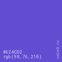 Цвет #624CD2 в цветовой модели RGB обозначается тремя октетами (98, 76, 210) в десятичном формате и #624CD2 в шестнадцатиричном (hex) формате, которые являются интенсивностью красного 98 (hex 62), интенсивность зелёного 76 (hex 4C) и интенсивность синего 210 (hex D2).