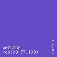 Цвет #624DC6 в цветовой модели RGB обозначается тремя октетами (98, 77, 198) в десятичном формате и #624DC6 в шестнадцатиричном (hex) формате, которые являются интенсивностью красного 98 (hex 62), интенсивность зелёного 77 (hex 4D) и интенсивность синего 198 (hex C6).