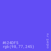 Цвет #624DF5 в цветовой модели RGB обозначается тремя октетами (98, 77, 245) в десятичном формате и #624DF5 в шестнадцатиричном (hex) формате, которые являются интенсивностью красного 98 (hex 62), интенсивность зелёного 77 (hex 4D) и интенсивность синего 245 (hex F5).