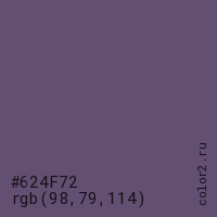 Цвет #624F72 в цветовой модели RGB обозначается тремя октетами (98, 79, 114) в десятичном формате и #624F72 в шестнадцатиричном (hex) формате, которые являются интенсивностью красного 98 (hex 62), интенсивность зелёного 79 (hex 4F) и интенсивность синего 114 (hex 72).