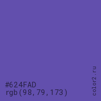 Цвет #624FAD в цветовой модели RGB обозначается тремя октетами (98, 79, 173) в десятичном формате и #624FAD в шестнадцатиричном (hex) формате, которые являются интенсивностью красного 98 (hex 62), интенсивность зелёного 79 (hex 4F) и интенсивность синего 173 (hex AD).