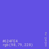 Цвет #624FE4 в цветовой модели RGB обозначается тремя октетами (98, 79, 228) в десятичном формате и #624FE4 в шестнадцатиричном (hex) формате, которые являются интенсивностью красного 98 (hex 62), интенсивность зелёного 79 (hex 4F) и интенсивность синего 228 (hex E4).