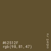 Цвет #62512F в цветовой модели RGB обозначается тремя октетами (98, 81, 47) в десятичном формате и #62512F в шестнадцатиричном (hex) формате, которые являются интенсивностью красного 98 (hex 62), интенсивность зелёного 81 (hex 51) и интенсивность синего 47 (hex 2F).