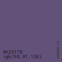 Цвет #625178 в цветовой модели RGB обозначается тремя октетами (98, 81, 120) в десятичном формате и #625178 в шестнадцатиричном (hex) формате, которые являются интенсивностью красного 98 (hex 62), интенсивность зелёного 81 (hex 51) и интенсивность синего 120 (hex 78).