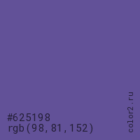 Цвет #625198 в цветовой модели RGB обозначается тремя октетами (98, 81, 152) в десятичном формате и #625198 в шестнадцатиричном (hex) формате, которые являются интенсивностью красного 98 (hex 62), интенсивность зелёного 81 (hex 51) и интенсивность синего 152 (hex 98).