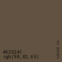 Цвет #625241 в цветовой модели RGB обозначается тремя октетами (98, 82, 65) в десятичном формате и #625241 в шестнадцатиричном (hex) формате, которые являются интенсивностью красного 98 (hex 62), интенсивность зелёного 82 (hex 52) и интенсивность синего 65 (hex 41).