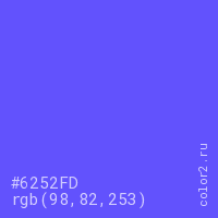 Цвет #6252FD в цветовой модели RGB обозначается тремя октетами (98, 82, 253) в десятичном формате и #6252FD в шестнадцатиричном (hex) формате, которые являются интенсивностью красного 98 (hex 62), интенсивность зелёного 82 (hex 52) и интенсивность синего 253 (hex FD).