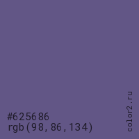Цвет #625686 в цветовой модели RGB обозначается тремя октетами (98, 86, 134) в десятичном формате и #625686 в шестнадцатиричном (hex) формате, которые являются интенсивностью красного 98 (hex 62), интенсивность зелёного 86 (hex 56) и интенсивность синего 134 (hex 86).