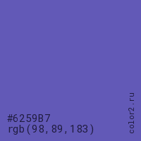 Цвет #6259B7 в цветовой модели RGB обозначается тремя октетами (98, 89, 183) в десятичном формате и #6259B7 в шестнадцатиричном (hex) формате, которые являются интенсивностью красного 98 (hex 62), интенсивность зелёного 89 (hex 59) и интенсивность синего 183 (hex B7).