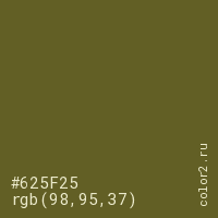 Цвет #625F25 в цветовой модели RGB обозначается тремя октетами (98, 95, 37) в десятичном формате и #625F25 в шестнадцатиричном (hex) формате, которые являются интенсивностью красного 98 (hex 62), интенсивность зелёного 95 (hex 5F) и интенсивность синего 37 (hex 25).