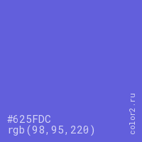 Цвет #625FDC в цветовой модели RGB обозначается тремя октетами (98, 95, 220) в десятичном формате и #625FDC в шестнадцатиричном (hex) формате, которые являются интенсивностью красного 98 (hex 62), интенсивность зелёного 95 (hex 5F) и интенсивность синего 220 (hex DC).