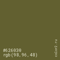 Цвет #626030 в цветовой модели RGB обозначается тремя октетами (98, 96, 48) в десятичном формате и #626030 в шестнадцатиричном (hex) формате, которые являются интенсивностью красного 98 (hex 62), интенсивность зелёного 96 (hex 60) и интенсивность синего 48 (hex 30).