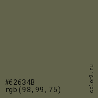 Цвет #62634B в цветовой модели RGB обозначается тремя октетами (98, 99, 75) в десятичном формате и #62634B в шестнадцатиричном (hex) формате, которые являются интенсивностью красного 98 (hex 62), интенсивность зелёного 99 (hex 63) и интенсивность синего 75 (hex 4B).