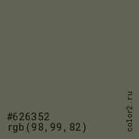Цвет #626352 в цветовой модели RGB обозначается тремя октетами (98, 99, 82) в десятичном формате и #626352 в шестнадцатиричном (hex) формате, которые являются интенсивностью красного 98 (hex 62), интенсивность зелёного 99 (hex 63) и интенсивность синего 82 (hex 52).